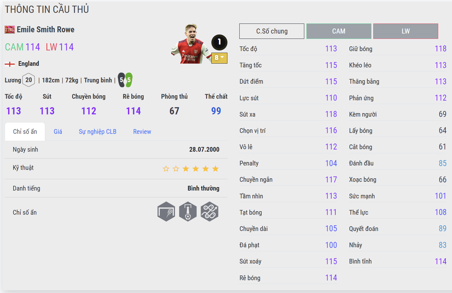 Tiền vệ công của Arsenal được xem là một trong những tài năng vô cùng đáng giá của lò đào tạo trẻ. Không phải ngẫu nhiên mà Smith Rowe được sở hữu chiếc áo số 10 huyền thoại của Arsenal. Tốc độ tốt, kỹ năng sút rất hiệu quả ở cả trong lẫn ngoài vòng cấm. Khả năng chuyền bóng thông minh và một AI di chuyển rất nhạy bén khiến Smith Rowe thực sự là một tiền vệ công chất lượng ở mức thẻ cộng cao mùa 21NG