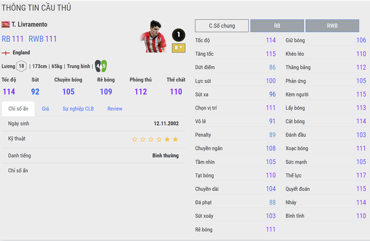 Nếu hành lang trái có Mendes thì hành lang phải ở vị trí phòng ngự không thể bỏ qua Livramento 21NG. Cầu thủ người Anh có tốc độ rất tốt, kỹ năng phòng ngự rất hay và đặc biệt khả năng hỗ trợ tấn công ổn định khiến anh trở thành một trong những hậu vệ phải toàn tương đối toàn diện ở meta hiện tại. Livramento thể hiện sự chắc chắn trong khâu phòng ngự từ kỹ năng đánh chặn, tì đè tranh chấp cho đến những vào bóng rất khó chịu khiến anh trở thành cái tên đáng được sử dụng bậc nhất.