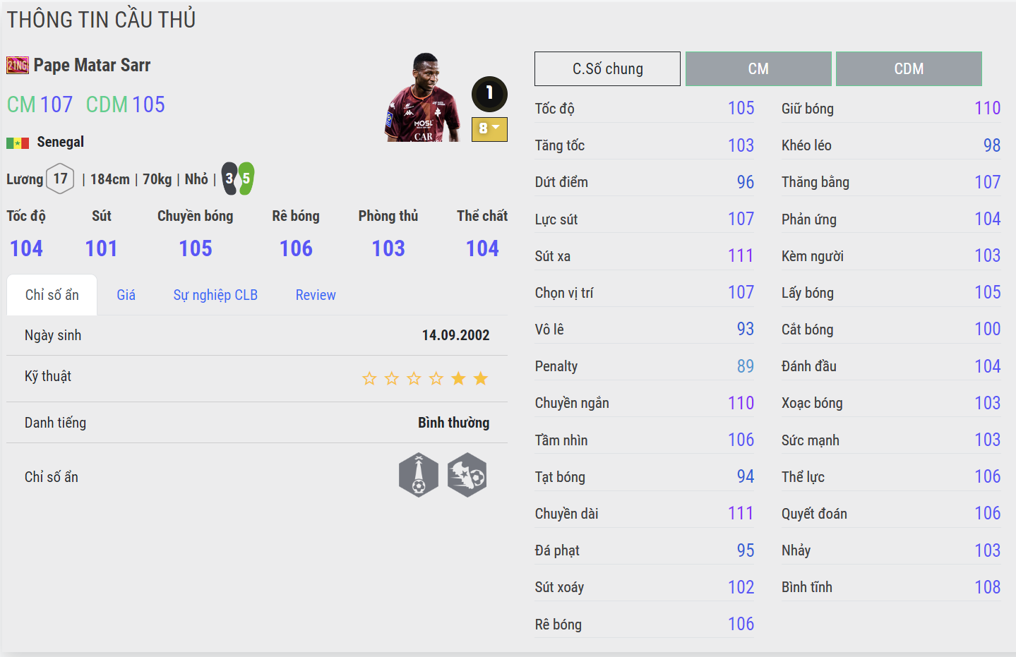 Nếu các HLV đang tìm một tiền vệ trung tâm lương thấp mà hiệu quả thì Sarr là cái tên không thể bỏ qua. Cầu thủ người Senegal khá toàn diện ở hầu hết các vị trí trên sân từ tốc độ, khả năng chuyền bóng, khả năng đánh chặn, phòng ngự hay thậm chí hỗ trợ tấn công đều rất hiệu quả. Sở hữu cho mình team color Tottenham, Sarr thực sự là một cái tên sáng giá cho vị trí tiền vệ trung tâm lương thấp cộng cao.