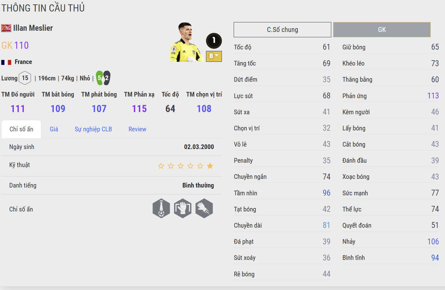 Thủ môn thuộc biên chế Leeds United là một cái tên rất đáng được quan tâm trong khung gỗ khi anh là cầu thủ được đánh giá tốt nhất mùa 21NG về độ hiệu quả trong game. Thể hình cao, kỹ năng bắt bóng, cản phá bóng hay chống bóng bổng của Meslier đều rất tốt và hiệu quả. Điểm đặc biệt khiến Meslier nổi bật chính là khả năng phản xạ cực kì nhanh nhạy và có phần hơi xuất thần. Anh thường xuyên có những pha phản xả cực tốt với độ chính xác trong những cú cản phá rất cao khiến nhiều HLV phải ôm hận khi đối đầu với anh.