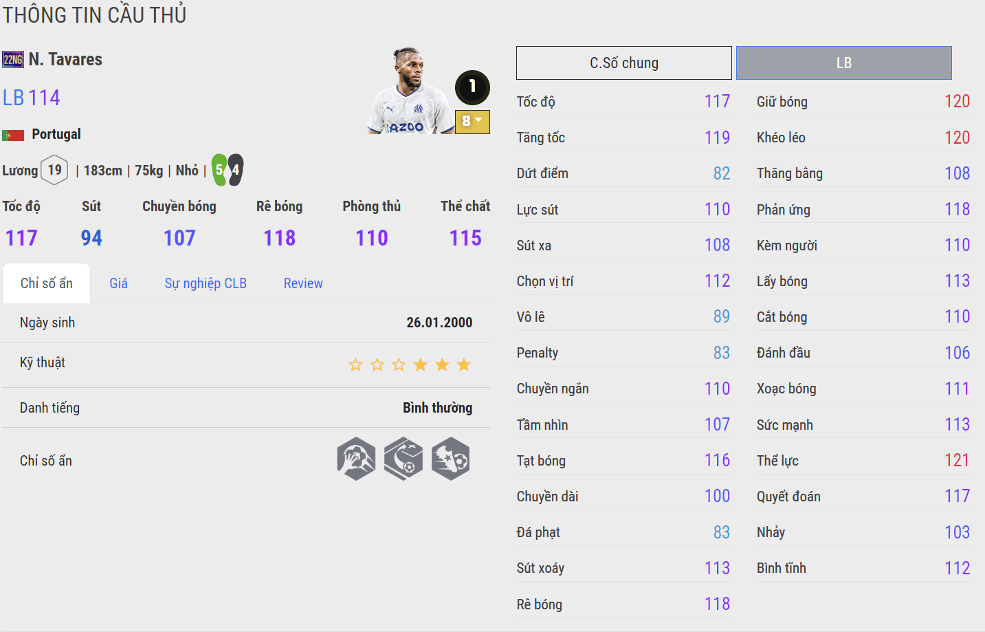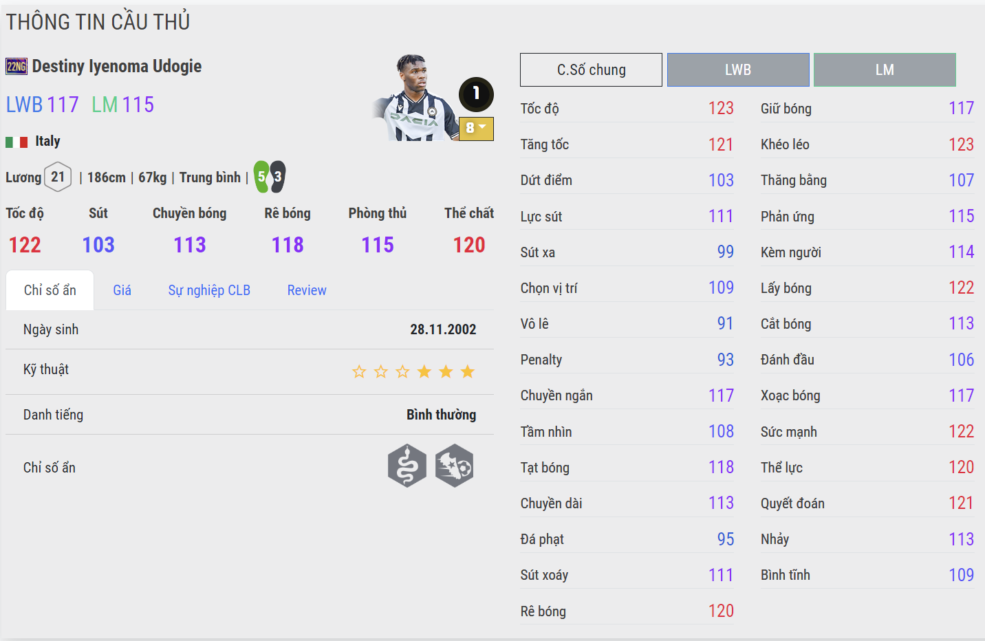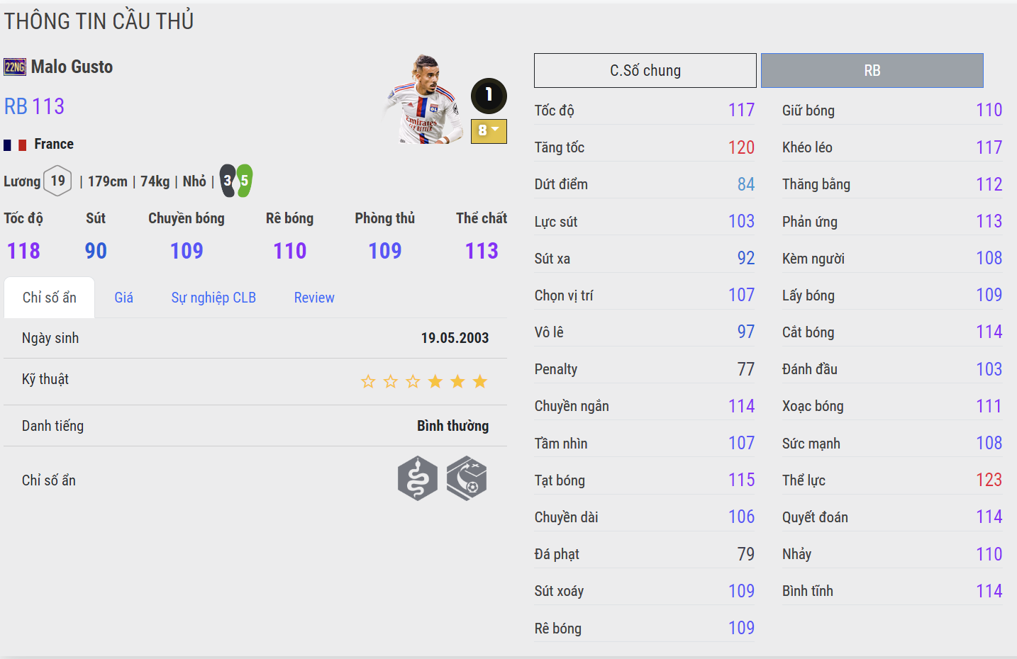 Tài năng trẻ hiện đang khoác áo Chelsea là cái tên đáng dùng nhất mùa thẻ 22NG, không chỉ có kỹ năng phòng ngự nổi bật, tốc độ cũng là thứ khiến Gusto trở nên đáng dùng ở mùa thẻ này. Với mức lương không quá cao và bộ kỹ năng phòng ngự lẫn hỗ trợ tấn công đều tốt, Gusto hiện đang được đánh giá rất cao và được nhiều HLV tin dùng cho vị trí hậu vệ phải của Chelsea hay Lyon.