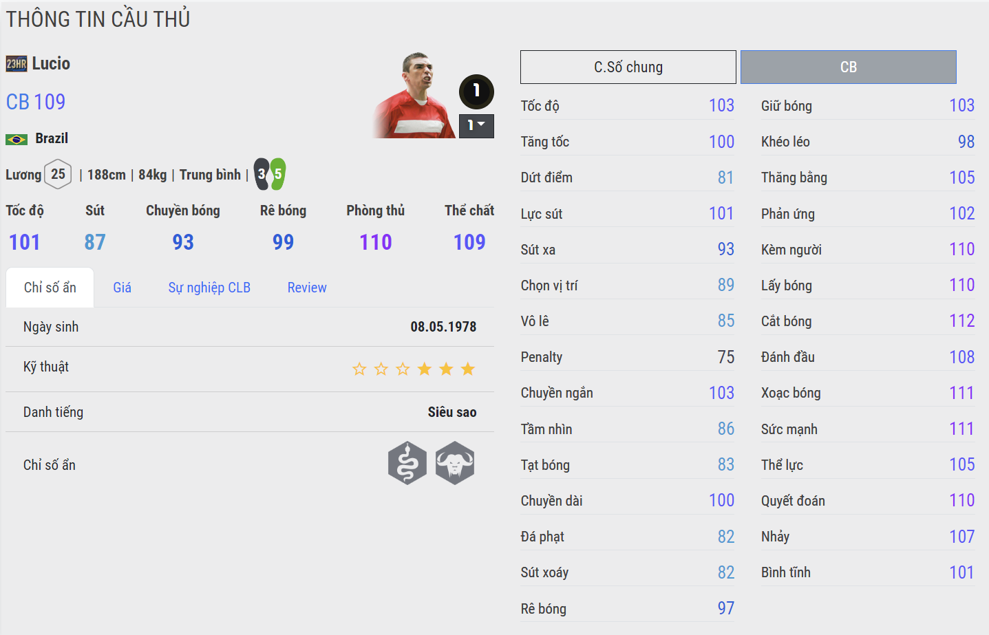 Hậu vệ người Brazil từng rất được mong chờ khi mùa thẻ 23HR ra mắt. Anh là trung vệ từng được nhiều fan hâm mộ Brazil yêu mến, sở hữu thể hình to khỏe, kỹ năng phòng ngự thông minh, khả năng tranh chấp, đánh chặn phòng ngự cho đến không chiến của Lucio đều rất tốt. Không những thế sức tì đè của Lucio cũng là rất khỏe. Vấn đề tốc độ của Lucio cũng không phải quá lo ngại khi anh vẫn cho thấy được sự hiệu quả nhất định trong các tình huống bám đuổi hay ập vào truy cản.