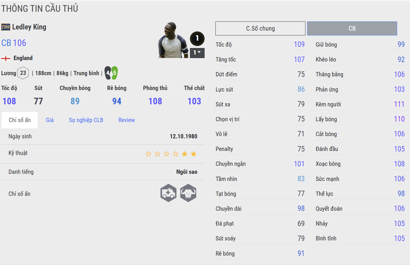 Trung vệ người Anh được xem là cái tên đáng dùng bậc nhất cho team color Anh thời điểm hiện tại. Thể hình to khỏe, sức tì đè trâu và kỹ năng phòng ngự thông minh. L. King còn sở hữu kỹ năng không chiến tốt cùng khả năng bật nhảy khá ổn. Điểm nổi bật của L. King nằm ở tốc độ và khả năng tăng tốc trong những tình huống phòng ngự cũng như áp sát phòng ngự của cầu thủ người Anh đều rất nhanh và hiệu quả.
