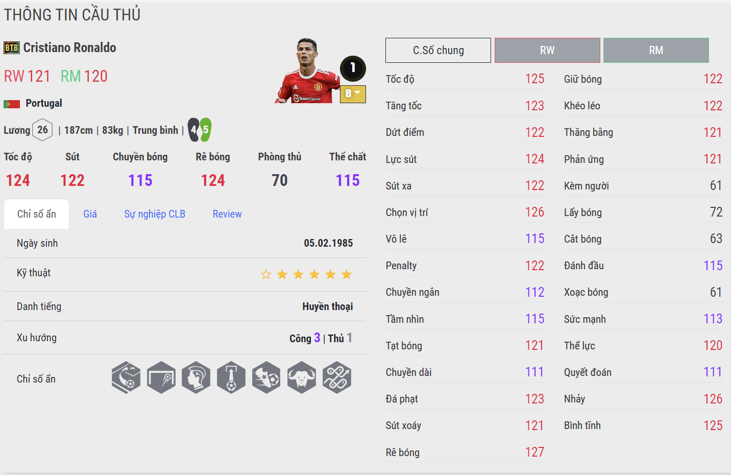 Vẫn được đánh giá là một trong những mùa thẻ CR7 có giá trị sử dụng cao, không khó hiểu khi Ronaldo BTB tiếp tục là cái tên được nhiều game thủ quan tâm ở thời điểm hiện tại. Điểm không ổn duy nhất của Ronaldo BTB chính là việc bị ảo giá. Còn lại từ chạy cánh cho đến đá tiền đạo cắm, Ronaldo gần như toàn diện về khả năng tấn công từ dứt điểm, sút xa, không chiến, chuyền bóng, rê dắt cho đến cả tạt bóng.
