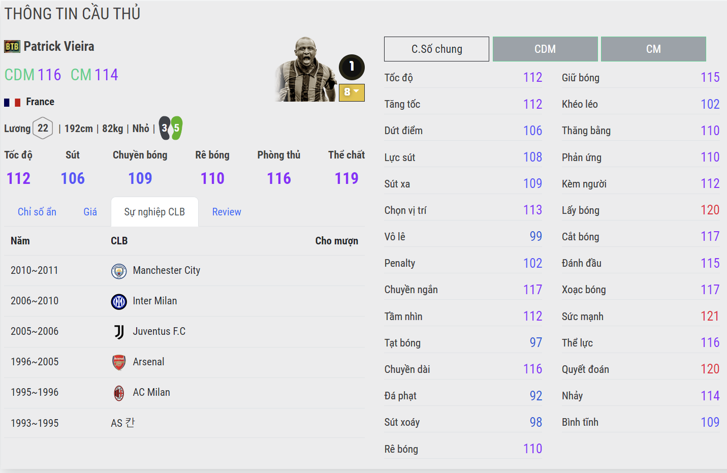 Tiền vệ trung tâm người Pháp được đánh giá cao về giá trị sử dụng cũng như chất lượng bởi tốc độ tốt, kỹ năng phòng ngự hay và sở hữu nhiều team color chất lượng như Arsenal, Man City, AC Milan, Inter, Juventus. Vieira đánh chặn tốt, AI phòng ngự khôn cùng với thể hình to khỏe và không ngại va chạm với các đồng đội.