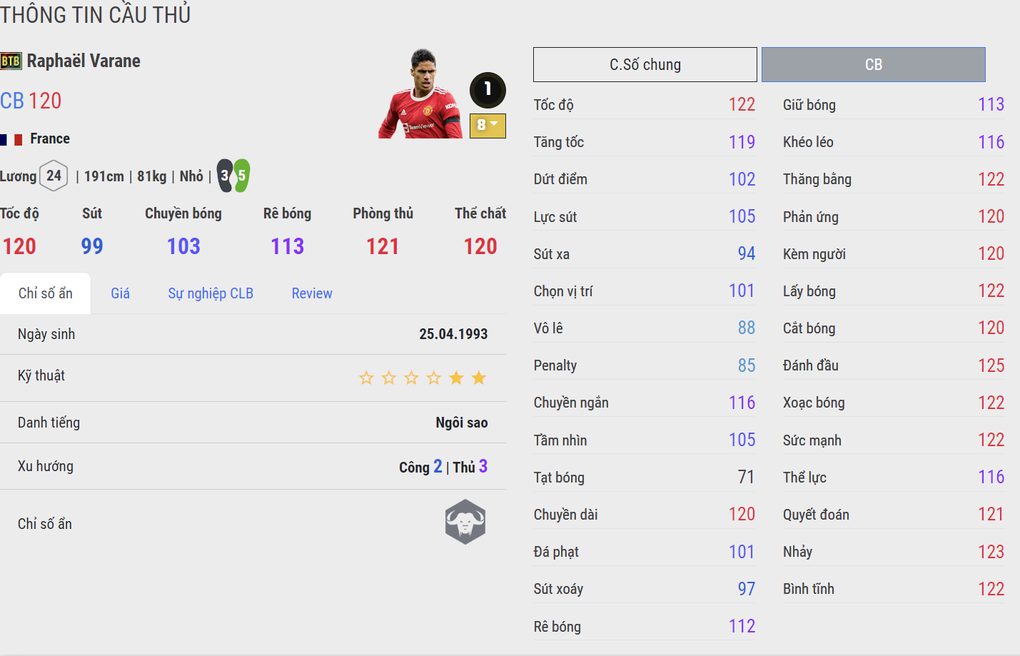 Vẫn được đánh giá là cái tên hàng đầu ở mùa thẻ BTB, Varane sở hữu tốc độ tốt, thể hình ổn, lối chơi linh hoạt và khả năng đánh chặn rất hay. Anh được xem là một cái tên quốc dân cho vị trí phòng ngự và ở mức thẻ cộng cao sẽ khiến các tiền đạo quốc dân gặp khó khi phải đối đầu với Varane
