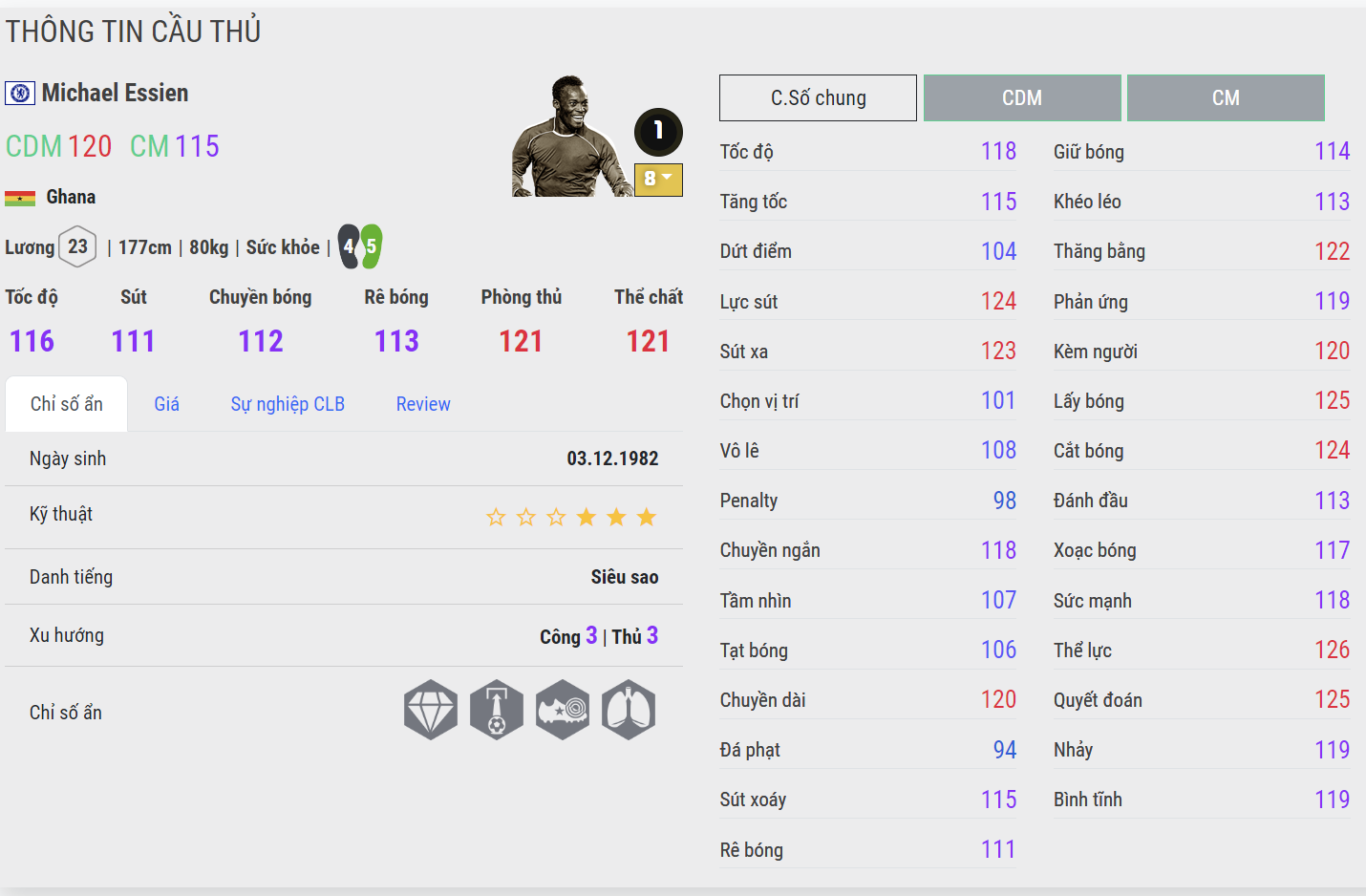 Essien luôn được xem là một CDM quốc dân bởi sự đa năng, toàn diện và có khả năng thích nghi được với rất nhiều meta game khác nhau. Tốc độ, kỹ năng sút xa cực chính xác cùng khả năng phòng ngự, đánh chặn rất ổn khiến Essien được tin dùng cho vị trí tiền vệ phòng ngự. Có cho mình những team color chất lượng như Chelsea, Real Madrid và AC Milan. Essien thực sự là một quân bài chất lượng thời điểm hiện tại.
