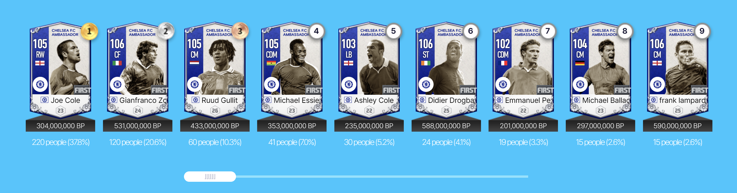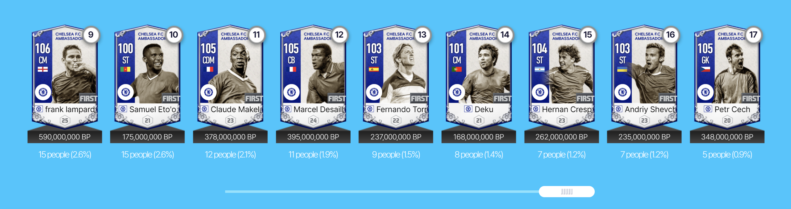 Có tổng cộng 17 huyền thoại Chelsea sẽ góp mặt trong mùa thẻ mới này. Đây đều là những công thần của nửa xanh thành London qua nhiều thời kỳ khác nhau. Qua một khoảng thời gian dài mà người chơi trải nghiệm, nhiều cầu thủ đã được định hình lối chơi rõ ràng và một trong số đó vẫn rất hợp cho đến meta hiện tại khi nhiều những mùa thẻ mới đã ra mắt.