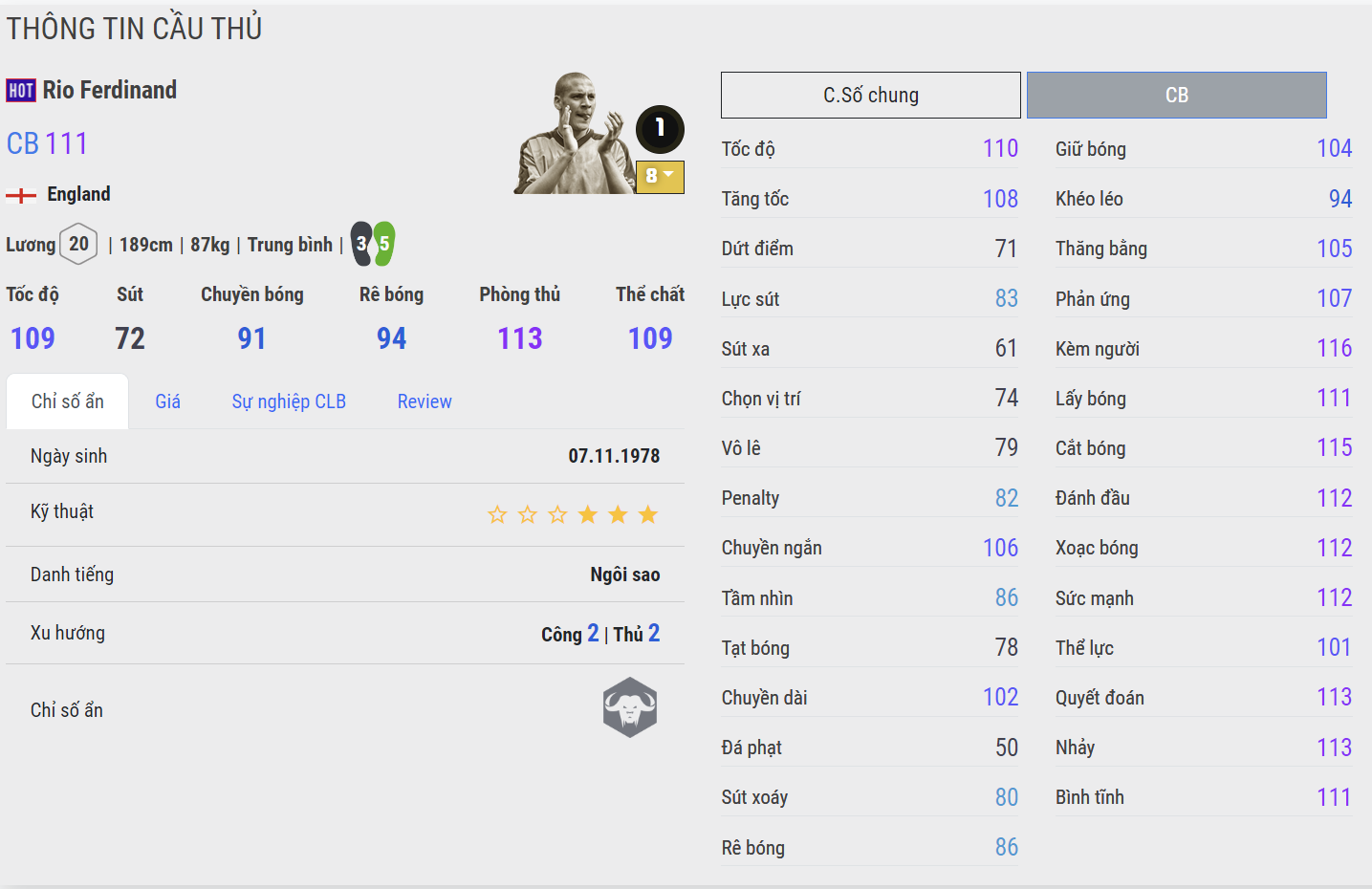 Trung vệ người Anh vẫn đang là một cái tên đáng dùng của mùa giải HOT ở mức thẻ +8. Điểm mạnh về tốc độ, khả năng phòng ngự và sức tì đè khỏe là điều mà Ferdinand đều có. Không những thế, mức lương rẻ chính là thứ khiến nhiều người chơi tin tưởng sử dụng cầu thủ người Anh nhằm mục đích nâng lương 2 cánh và tối ưu chất lượng cho các vị trí khác.