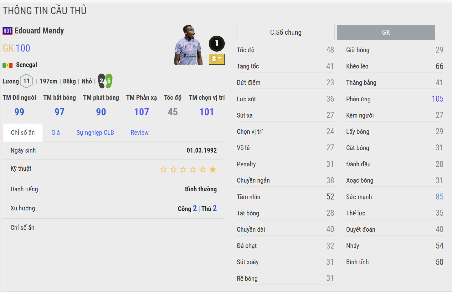 Cựu thủ môn Chelsea là cái tên tiếp theo được quan tâm cho mùa giải HOT. Mendy có AI bắt bóng cực hay, sải tay rất dài và cản phá những cú sút xa cực kì hiệu quả. Đây là thủ môn cân lương có giá trị sử dụng rất cao với chỉ 11 lương khiến rất nhiều fan Chelsea muốn sở hữu trong đội hình nhằm tối ưu các vị trí khác và tìm kiếm làn gió mới nơi khung gỗ thay cho con hàng quốc dân Courtois.