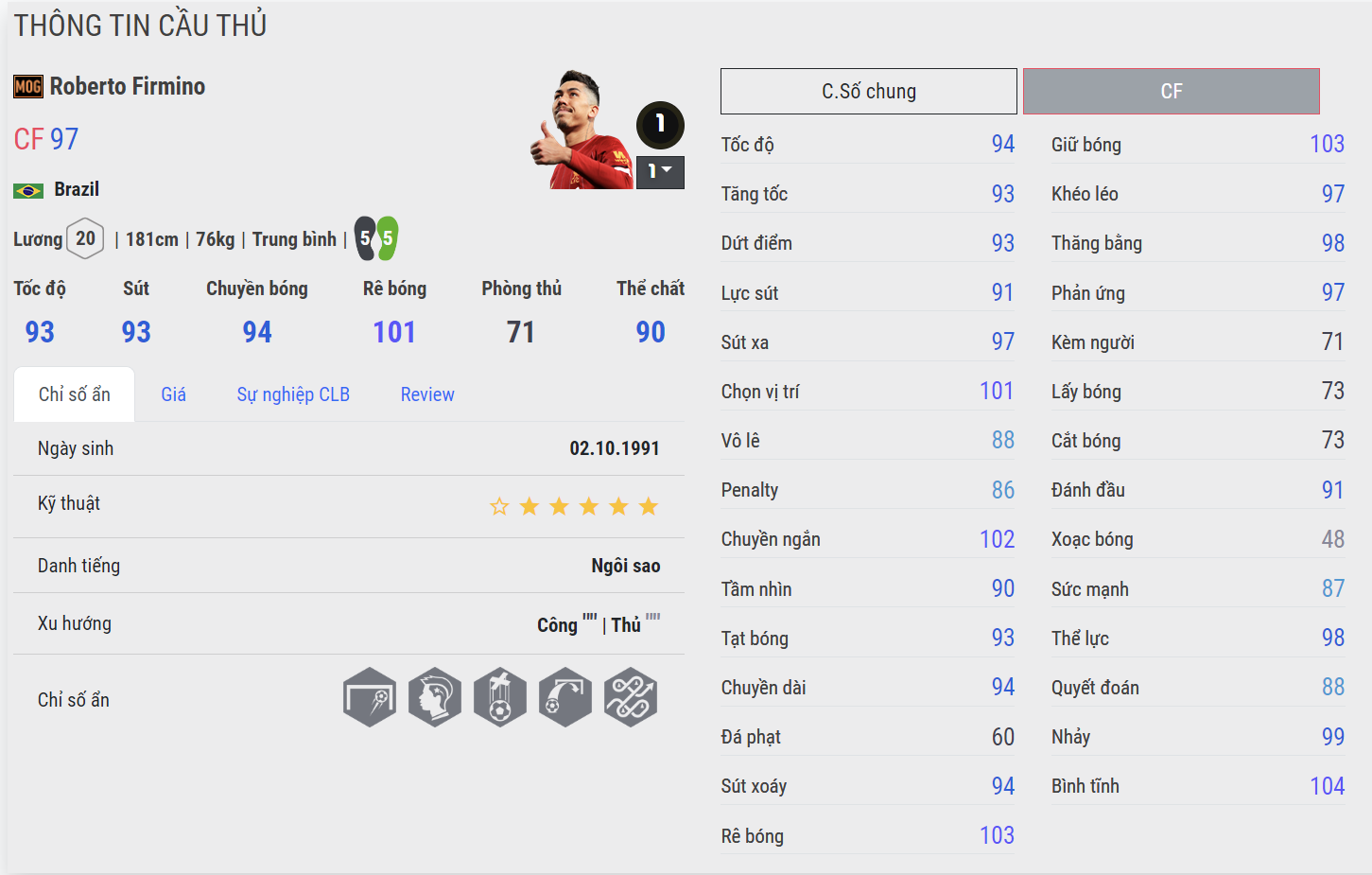 Tiền đạo Liverpool vẫn cho thấy giá trị của mình ở mùa thẻ MOG. Firmino là một trong số ít nhwungx mùa thẻ giữ được AI thi đấu rất ổn định và là một mùa giải rất uy tín nếu được nâng lên mức thẻ +8. Khả năng chuyền chọt, dứt điểm ,tốc độ , rê bóng đều ổn. Đặc biệt đây là mùa giải hiếm hoi Firmino có 2 chân 5-5 nên rất dễ dàng tối ưu được những tình huống chuyền chọt, dứt điểm bằng cả 2 chân.