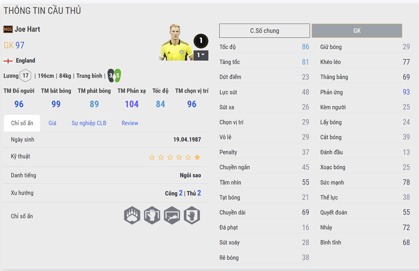 Cựu thủ môn của Man City được xem như là một trong những cầu thủ chủ chốt giúp Man City chuyển mình trở thành một trong những CLB hàng đầu Ngoại Hạng Anh cho đến thời điểm hiện tại. Điểm mạnh của Joe Hart nằm ở khả năng bay người cản phá những cú sút xa và ZD rất ảo. Đây là một trong những thủ môn đáng sử dụng cho team color Anh cũng như CLB Man City.