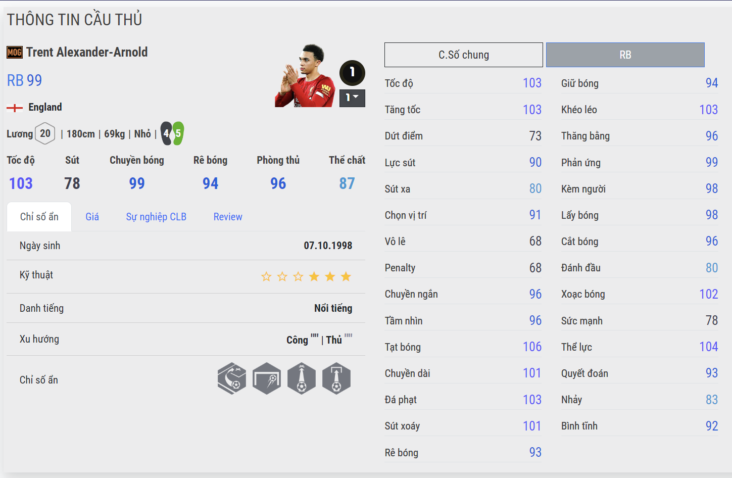 Lối đá ở meta hiện tại chú trọng nhiều vào những hậu vệ biên có khả năng leo biên, hỗ trợ tấn công hoặc thậm chí thi đấu ở vị trí tiền vệ cánh vừa tham gia công vừa hỗ trợ phòng ngự. Và hành lang phải không thể bỏ qua Arnold MOG bởi không chỉ khả năng tấn công hay, thủ tốt mà còn có bộ chỉ số ẩn hỗ trợ cực tốt cho mặt trận tấn công như : Chuyền dài, Sút xa, Tạt bóng sớm, Sút xoáy.