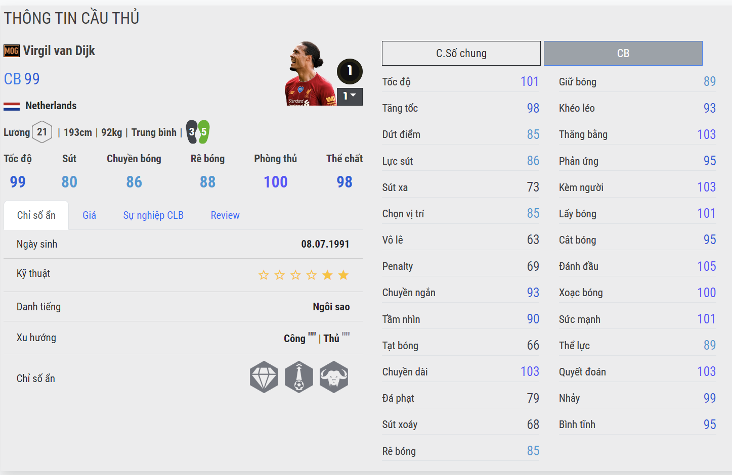 Trung vệ người Hà Lan cho thấy sự chắc chắn đến khó tin khi được nâng lên mức thẻ +8, rất khó để vượt qua cầu thủ vừa có sải chân dài, vừa có tốc độ tốt lại vừa có khả năng tì đè không ngán đối thủ nào. Không những vậy, khả năng cân lương cũng sẽ là điểm mạnh để Van Dijk MOG được tin dùng cho đến hiện tại.