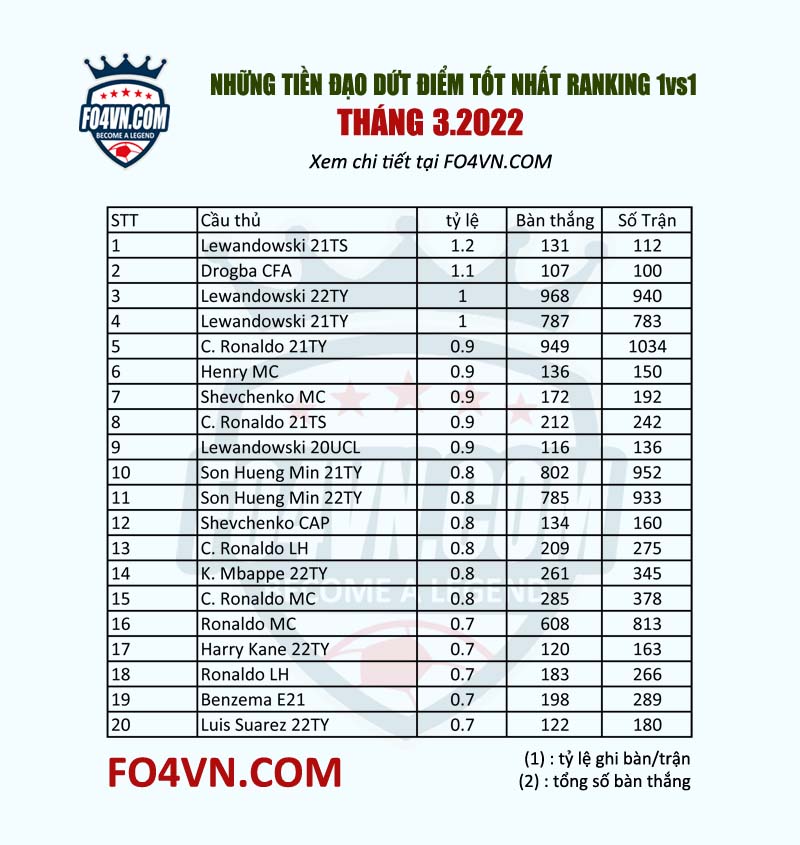 đến hẹn lại lên, chúng ta sẽ điểm qua 20 chân sút tốt nhất của tháng 3 theo tỷ lệ bàn thắng/trận