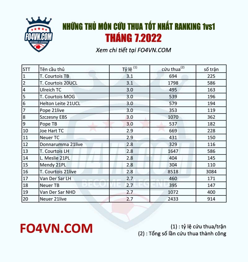 Sau đây là những thống kê về tỷ lệ cứu thua của các thủ môn trong trận đấu, trong top rank 3000 của Hàn Quốc trong tháng 3. Tròn một tháng từ ngày update gameplay.