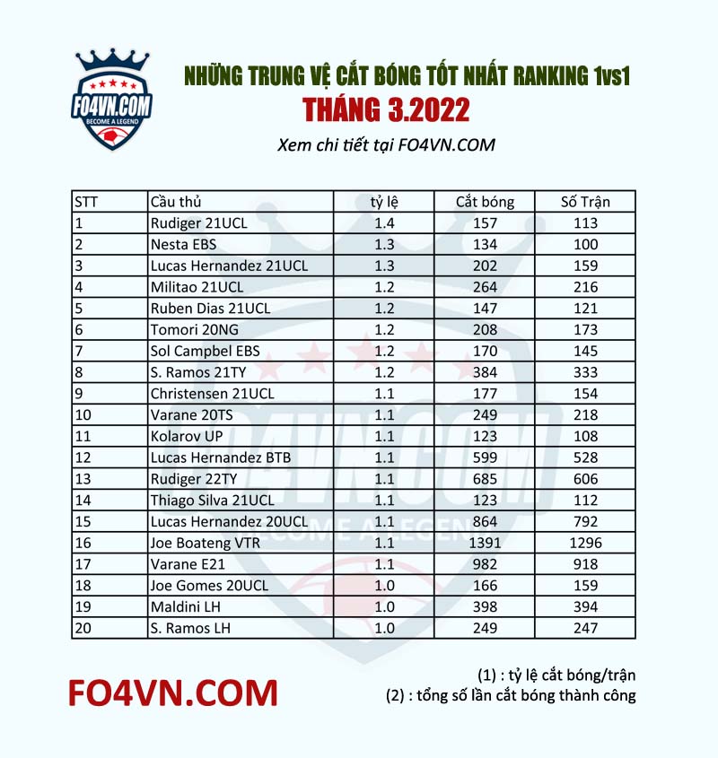 Chúng ta cũng đến với những trung vệ xuất sắc nhất tháng 3 ở khâu cắt bóng - tiêu chí được coi là quan trọng nhất hiện tại