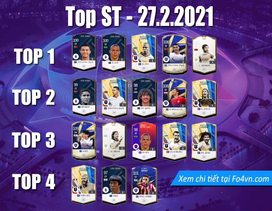 Sau hai tuần FO4VN xin được gửi tới các bạn top các tiền đạo được ưa dùng nhất trong rank 1vs1 tại máy chủ hàn quốc tính đến ngày 27.2.2021