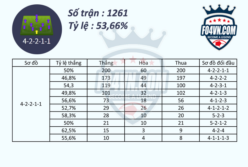Vậy lý do tại sao đây lại là sơ đồ được đánh giá cao nhất ? Chúng ta sẽ cùng xem thống kê dưới đây của 4-2-2-1-1 khi đối đầu với các sơ đồ trong top 10. ( danh sách sơ đồ xem tại đây )