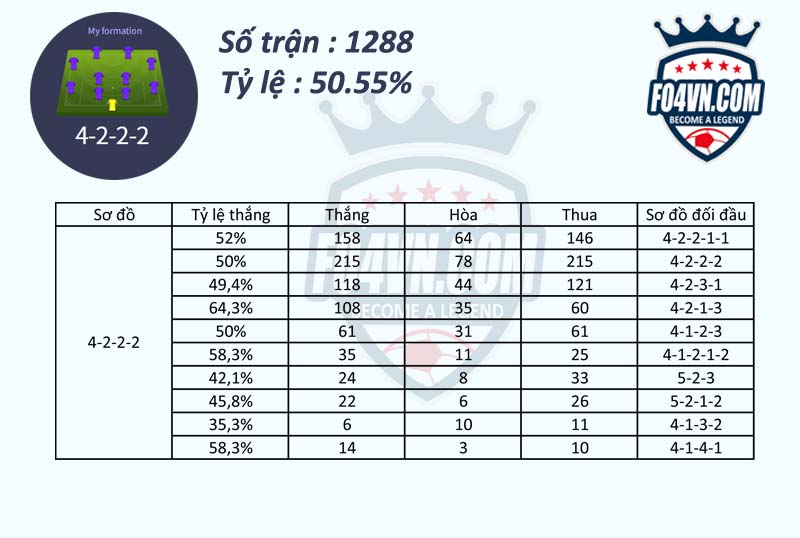 Chúng ta sẽ cũng đến với thống kê đối đầu của 4222 với các sơ đồ khác trong ranking xếp hạng 1vs1 xem sự hiệu quả ra sao.