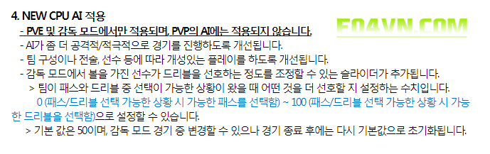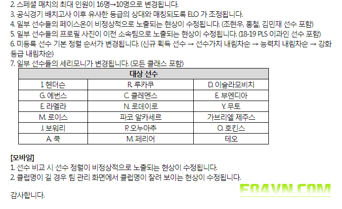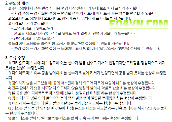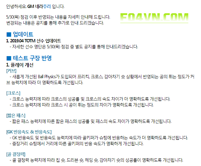Mới đây, trang chủ của FIFA Online 4 đăng tải clip thông báo về bản Update mới vớt rất nhiều cập nhật gameplay trong FIFA Online 4 Server Hàn Quốc. Tiếp ngay sau đó thì admin của FO4 Server Hàn cũng đã đăng tải trực tiếp nội dung của bản Update gameplay. Nội dung đố như sau :