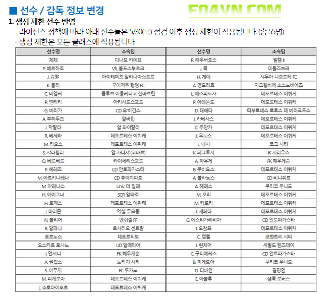 Sau ngày 30/5 sẽ có 55 cầu thủ dưới đây được liệt kê vào danh sách hạn chế.