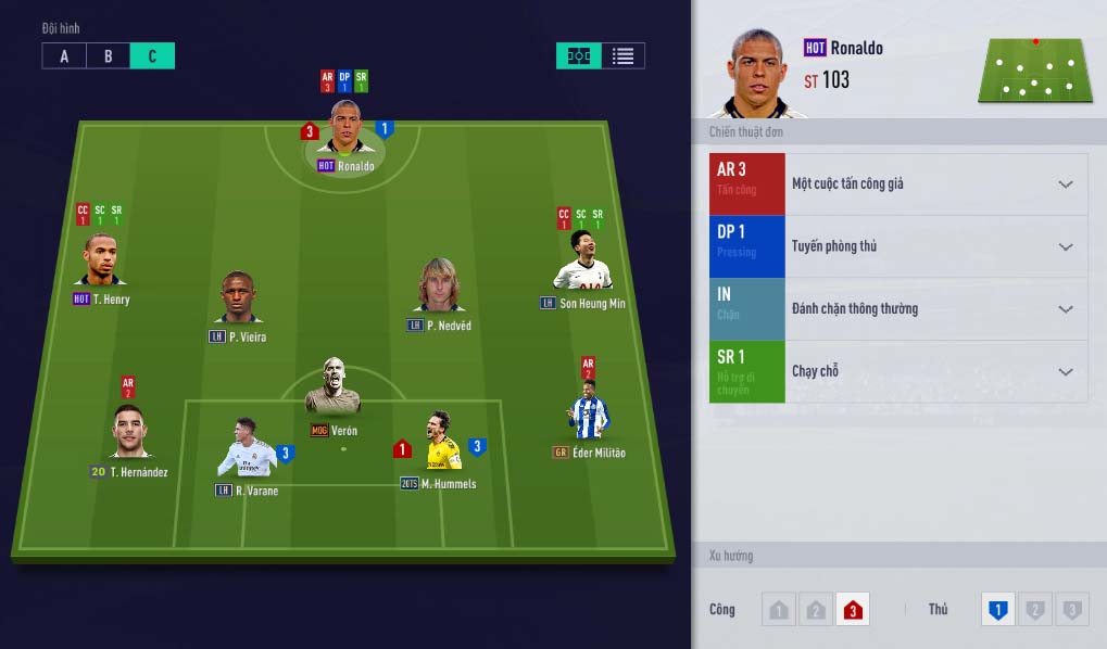 Tiền đạo : Có 4 sự lựa chọn là Trezeguet, Henry, Benzema, Mbappe. Và người được chọn là Trezeguet vì sự đa năng của cầu thủ này, anh thực sự là một sát thủ nơi vòng cấm với khả năng không chiến và dứt điểm. Tất nhiên các bạn có thể chọn 1 trong 3 cái tên còn lại, tùy vào sự phù hợp lối đá từng người.