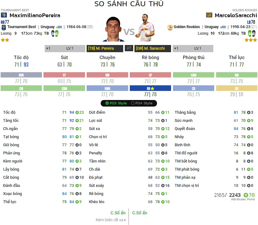 Chỉ số của Pereira và Saracchi | Nguồn : FO4PLAYER.COM