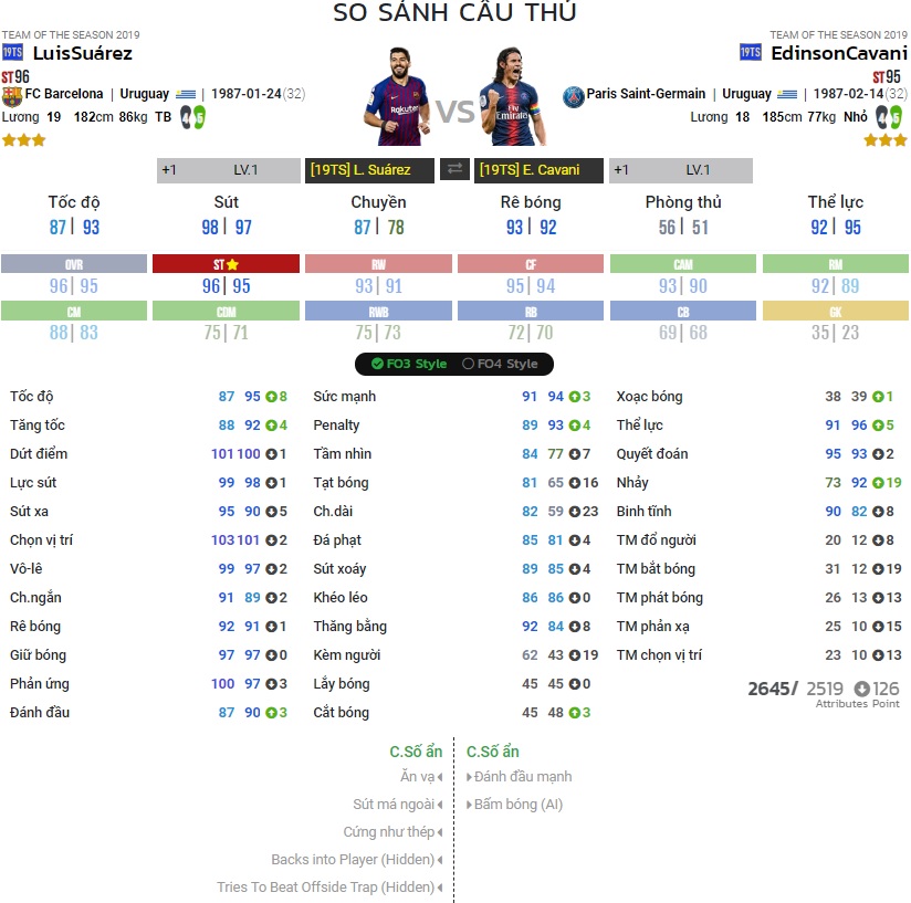 Chỉ số của Cavani và Suarez| Nguồn : FO4PLAYER.COM