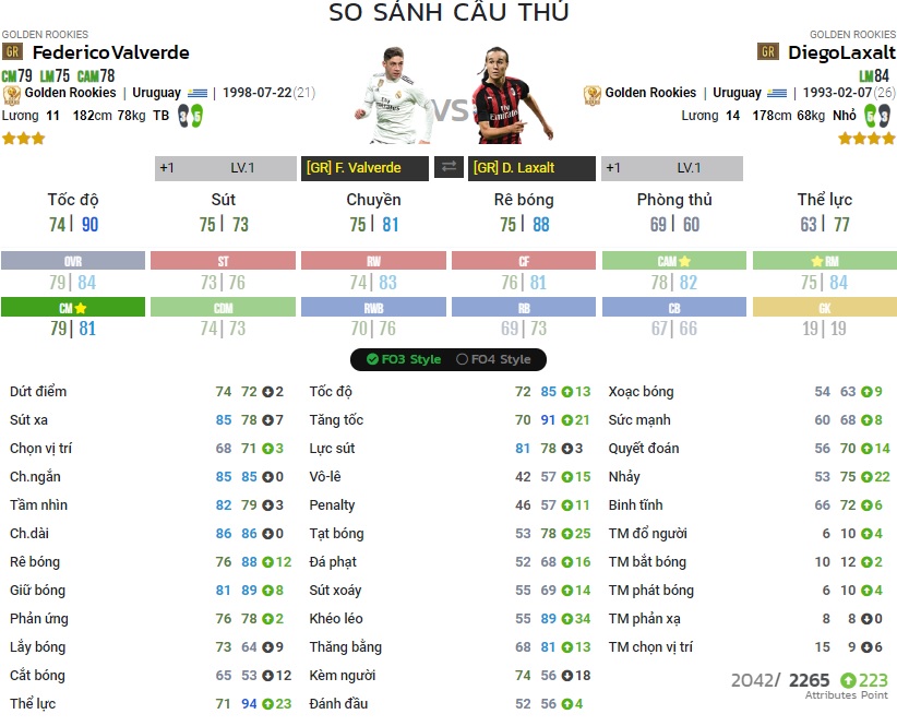 Chỉ số của Valverde và Laxalt | Nguồn : FO4PLAYER.COM