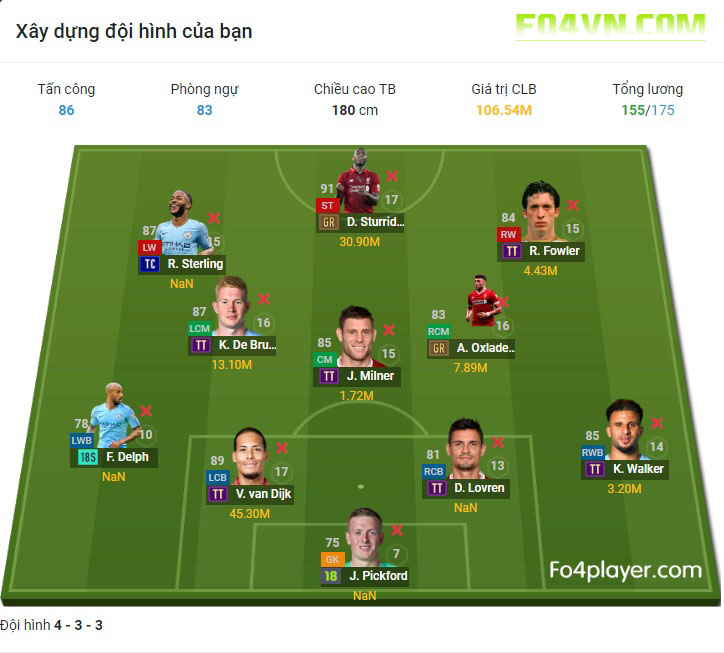 Đội hình này có tới 8 cái tên mang quốc tịch Anh bao gồm : Sterling, Sturridge, Fowler, Milner, Chamberlain, Walker, Delph, Pickford
