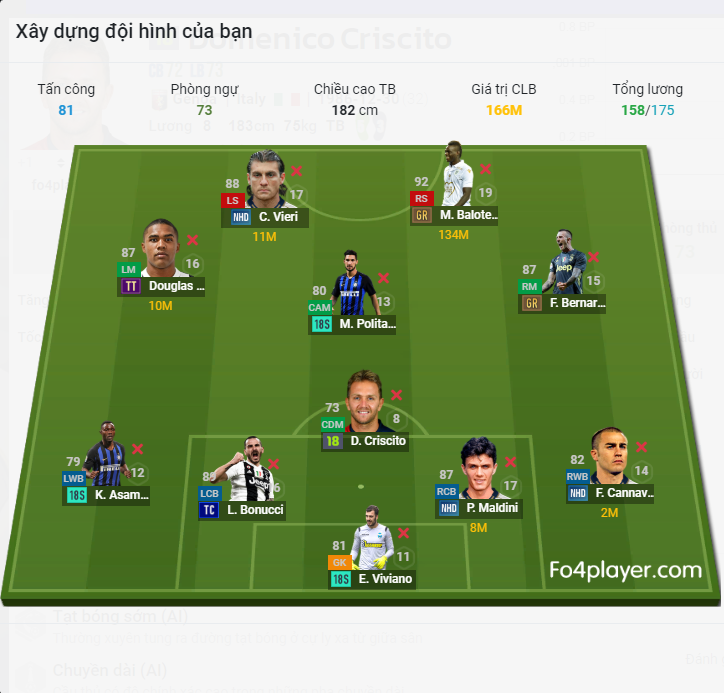 Sơ đồ sử dụng là sơ đồ 4-1-3-2 với chất lượng đội hình là rất tốt. Hàng công là cặp đôi to cao hổ báo Vieri và Balotelli. 2 vị trí này dứt điểm đều rất khét và khả năng không chiến cũng là rất đáng kể.