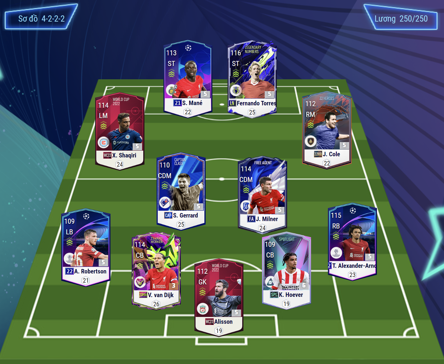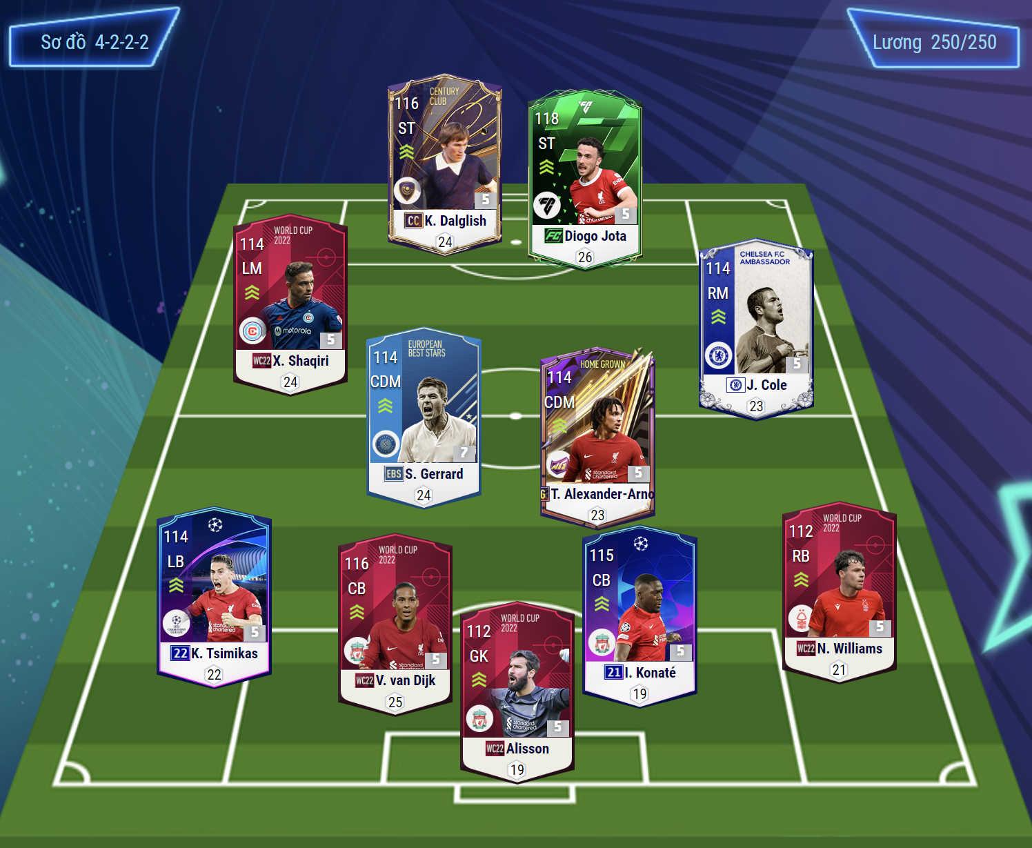 Cặp cánh Shaqiri và Cole giữ nguyên và chỉ nâng cấp chất lượng thẻ cho Cole lên màu CFA. Trong khi đó Gerrard sẽ đá cặp với Arnold mùa HG cho vị trí tiền vệ phòng ngự. Mùa thẻ Arnold HG được đánh giá rất cao về khả năng chuyền bóng và hỗ trợ tấn công.