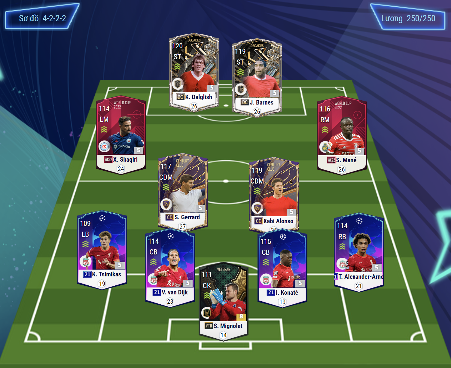 Cặp cánh vẫn giữ nguyên Shaqiri WC22, đây được xem là quốc dân nơi hành lang cánh và khó có thể thay thế anh nếu người chơi sử dụng cầu thủ chạy cánh mức thể +5. Cánh đối diện là Mane WC22 cũng có giá trị sử dụng và độ hiệu quả cực cao. Cặp tiền vệ trung tâm trứ danh một thời Gerrard và Alonso góp mặt với ưu điểm chuyền bóng và khả năng sút xa cực bá vốn là 2 điểm ưu tiên hàng đầu cho vị trí tiền vệ phòng ngự ở meta này.