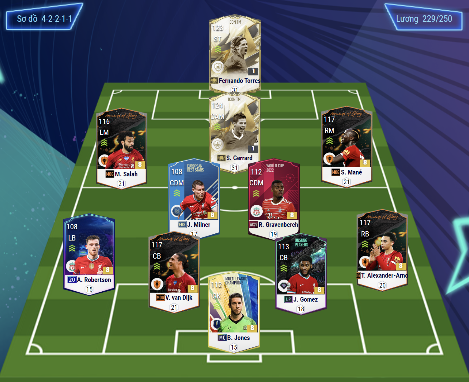 Ở giai đoạn này, người chơi sẽ nên ưu tiên sử dụng những cầu thủ cộng 8, mức thẻ đang được buff rất nhiều thời gian gần đây thay cho mức thẻ cộng 5 trước đó. Hàng công với Torres ICON TM cặp với Gerrard ICON TM thi đấu với và trò tiền vệ hộ công sẽ là cặp bài sát thủ đắt giá và cũng xuất sắc nhất cho Liverpool ở thời điểm hiện tại.